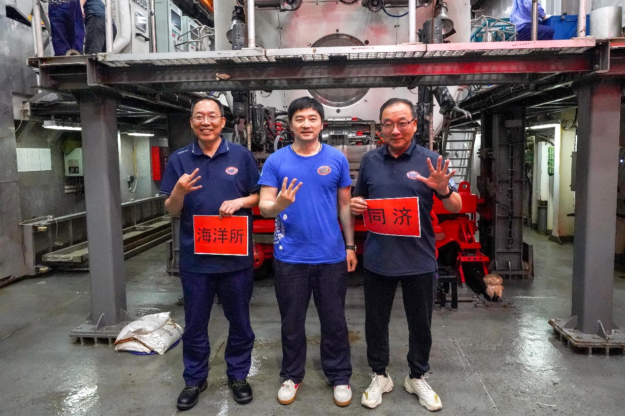 图2朱伟林老师与本航次首席科学家及领队(左:首席科学家栾锡武教授;中:朱伟林老师;右:领队孙永福教授级高工)