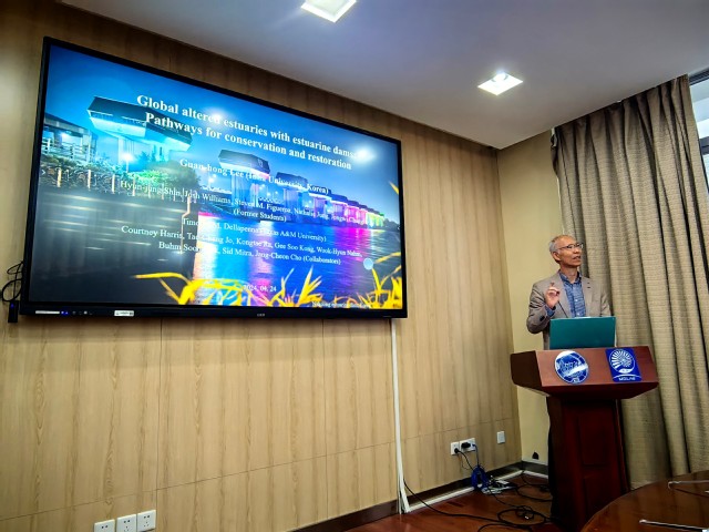 1023日,Lee教授在四平路校区作题为“Global altered estuaries with estuarine dams: Pathways for conservation and restoration(全球受大坝影响的河口:保护与修复的途径)的精彩报告。报告伊始,他系统梳理了全球受人类活动影响的河口分布及其与经济活动的关联;随后以韩国纳东河口为例,深入剖析了大坝建设后的形态平衡与恢复进程。长期数值模拟显示:该河口在自然恢复情景下约15年可达新的平衡;在人类干预改造的水动力与沉积物再分配后,因能量耗散降低,恢复速度显著加快,约9年内趋于稳定。模型准确再现了关键形态演变:大坝建设初期在波浪主导下形成屏障岛,恢复后则转为潮汐主导下的沙洲发育,并捕捉到沉积物质地从沙到泥再恢复为沙的变化过程。这项研究凸显了长期数值模拟在认识河口对人类干预的响应及评估恢复成效方面的价值,为制定可持续管理策略提供了重要依据。