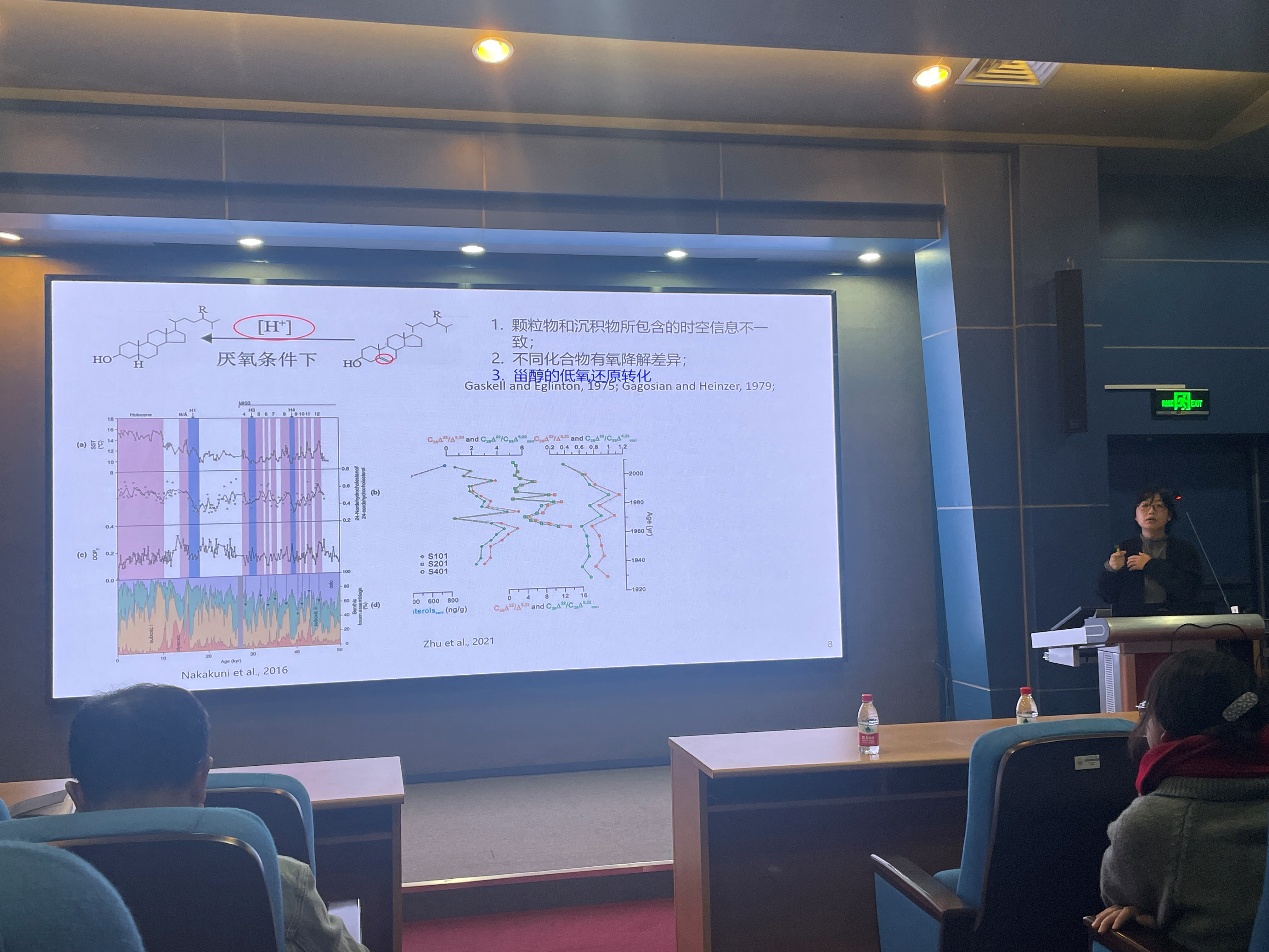 贺娟老师从甾醇在颗粒物与沉积物中的差异着手,指出低氧条件可促使甾醇发生向甾烷醇的还原反应,从而改变沉积物中生物标志物的原始组成。结合培养实验,验证了这一转化过程使得甾烷醇/甾醇比值上升,导致沉积记录偏离上层水体真实的浮游群落结构。报告强调,传统将颗粒物—沉积物差异解释为“时空信息不同”的做法难以充分解释观测现象,甾醇低氧转化应被纳入生物标志物解释框架,以避免误判古环境氧化还原状态和生产力信号,为提升低氧环境下古生态指标的可靠性提供重要依据。