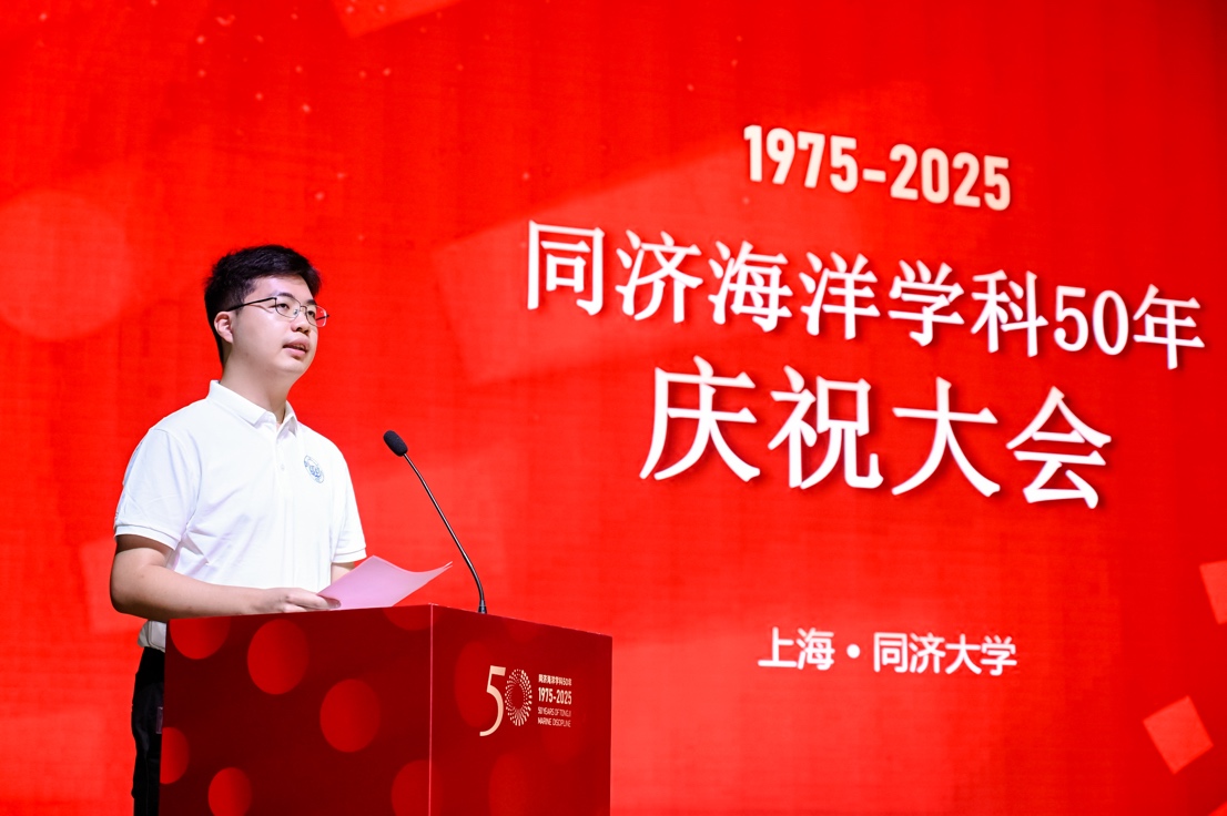 2022级本科生郭皓玮作为学生代表发言表示,个人的成长轨迹与学科、学院的发展紧密相连,将把课堂所学、科研所悟,转化为服务国家战略需求、推动人类海洋事业发展的实际行动,在海洋强国建设的壮阔蓝图上,奋力刻下属于同济海洋人的深蓝印记。