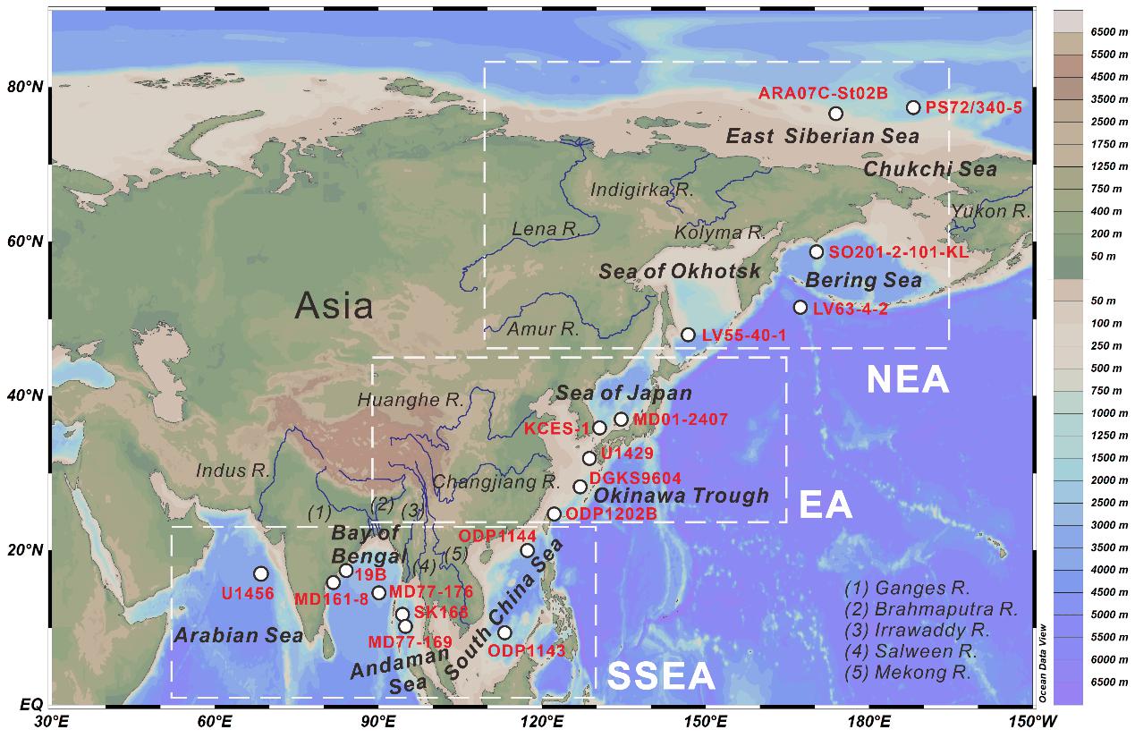 南亚和东南亚(SSEA)、东亚(EA)和东北亚(NEA)三个区域的钻孔站位