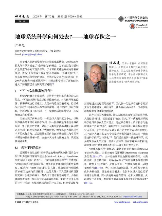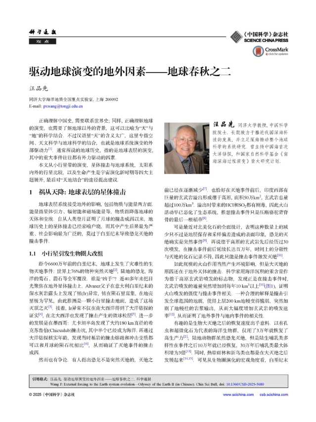 编者按:汪品先院士在《科学通报》上相继发表了《地球系统科学向何处去?——地球春秋之一》《驱动地球演变的地外因素——地球春秋之二》两篇长文,系统阐述了他对地球系统科学未来发展的深刻思考。汪院士后续还将聚焦地球深部和生物圈,继续撰写“地球谱写春秋“系列文章,并提出具体研究建议。现原文附下,推荐给所有关心地球系统科学未来、对探索自然根本规律感兴趣的读者。