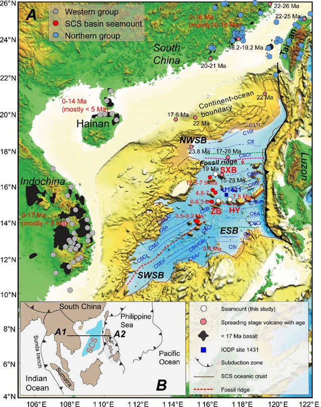 针对上述问题,研究人员选择南海扩张期间、扩张期后形成的多座海山作为研究对象(图1),对海山火山岩样品开展Ar-Ar和U-Pb年代学、全岩地球化学、熔体包裹体、以及矿物原位的元素和Sr-Pb同位素分析,并结合地球物理分析研究工作,取得了如下主要认识: