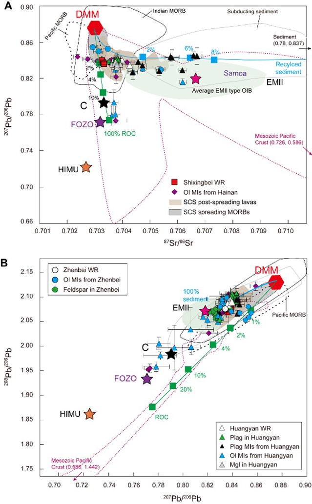 图2 南海海山玄武岩全岩、长石及熔体包裹体Sr-Pb同位素成分与源区特征(DMM-EM2-FOZO三端元混合)