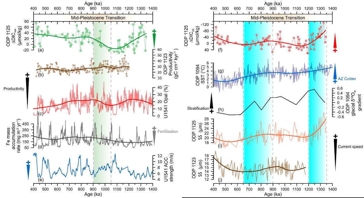 同济大学海洋地质全国重点实验室王汝建教授团队通过西南太平洋ODP1125站位底栖有孔虫 B/Ca、Cd/Ca 以及可选粉砂(Sortable silt)指标的研究,重建了过去 400-1350 ka 期间 AAIW 的溶解无机碳(Dissolved inorganic carbon, DIC)浓度及洋流流速变化。