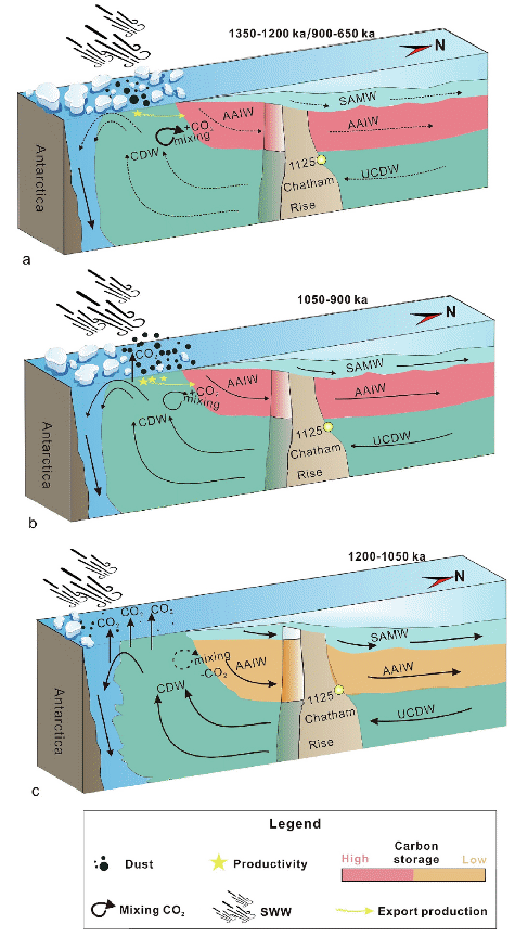 图3. 示意模型展示了中更新世气候转型期间西南太平洋碳储存与释放的控制机制。(a)南大洋分层控制的碳储存(1350-1200 ka / 900-650 ka);(b)亚南极生物泵控制的碳储存(1050-900 ka);(c)碳释放阶段(1200-1050 ka)。