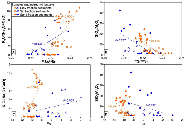 Abstract: Sr-Nd isotopic compositions are reliable proxies for tracing the provenance of riverine and marine sediments. However, these isotopic compositions can be influenced by processes such as chemical weathering in the source region and grain size sorting during transport, which can obscure the original provenance signals. In this study, Sr-Nd isotopic compositions of clay, silt, and sand fractions from river sediments in the Lower Mekong River Basin are analyzed to investigate the influence of chemical weathering and grain size sorting and their implications for provenance studies. Mainstream sediments exhibit higher 87Sr/86Sr (0.724) and lower εNd (−9.72) values compared to tributary sediments (0.717 and − 5.61, respectively). The clay fractions in both mainstream and tributary sediments show more radiogenic 87Sr/86Sr (0.726) and higher εNd (−7.29) values than the silt (0.721 and − 8.88, respectively) and sand (0.718 and − 9.27, respectively) fractions. Rb/Sr and 87Sr/86Sr in both mainstream and tributary sediments present moderate or strong correlations with K2O/(CaO + Na2O) and SiO2/Al2O3, indicating that chemical weathering and grain size sorting moderately influence Sr isotopes. In contrast, Sm/Nd and εNd display no or weak correlations with K2O/ (CaO + Na2O) and SiO2/Al2O3, suggesting that Nd isotopes are less affected by these factors. Despite these influences, significant differences in Sr-Nd isotopic compositions between mainstream and tributary sediments are evident, with moderate to strong negative correlations between 87Sr/86Sr and εNd across clay, silt, and sand fractions. These differences effectively distinguish the mainstream from the tributary sediments, reflecting the control of source rock lithology and the preservation of source rock signatures in this region. To minimize the effects of chemical weathering and grain size sorting, this study recommends using Sr-Nd isotopic data from uniform grain size fractions for provenance investigations of riverine and marine sediments, with the silt fraction being the most suitable.