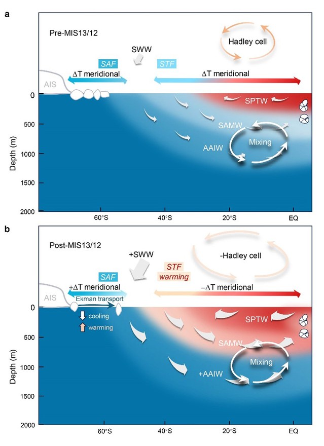 Abstract: The Mid-Brunhes Transition (MBT) signifies a pivotal shift in glacial–interglacial cycles with intensified interglacial warming, yet its underlying mechanisms remain elusive. Targeting the most sensitive component of oceanic heat uptake, the southern-sourced sub-surface waters, the post-MBT ocean heat dynamics are investigated using reconstructed deep and bottom thermocline temperatures from the Western Equatorial Pacific. Our results show that, since the MBT, the deep thermocline temperature has been gradually declining in association with cooling within the (sub)tropical Pacific upper ocean circulation. In contrast, the bottom thermocline temperature shows a pronounced rising trend independent of the calibration-derived uncertainties in its absolute estimates. Such post-MBT bottom thermocline warming is consistent with an enhanced advection of southern-sourced subsurface waters, as indicated by strengthened Southern Ocean meridional thermal gradients and concurrent warming in the southern subtropics. It is thus suggested that enhanced equatorward transport of southern-sourced subsurface waters, as a cross-hemispheric heat-redistribution pathway, may have elevated the background thermal state of post-MBT interglacials, highlighting the potential role of tropical-Southern Ocean connection in shaping climate trajectories.
